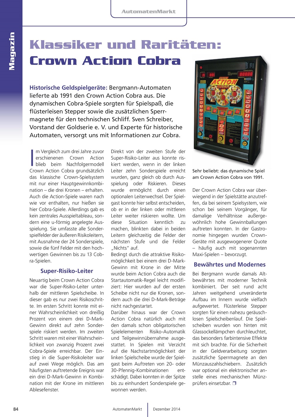 Mit dem Crown Action Cobra beabsichtigte die Firma Bergmann im Jahr 1991 an den Erfolg des Crown Action (1988) anzuknüpfen. Dieses Ziel wurde jedoch nur mit mäßigem Erfolg umgesetzt, sodass der Action Cobra deutlich weniger verbreitet ist als der beliebte Crown Action. Obwohl das Gerät optisch ansprechend gestaltet wurde und der Spielinhalt nicht unbedingt zu den schlechtesten gehört, schnitt das Gerät bei der Gunst um den Spieler eher bescheiden ab. Die Gründe hierfür sind unter anderem darin zu suchen, dass die 2 Action-Spiele durch Risiko deutlich spürbar seltener erreicht werden als beim Crown Action.