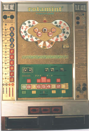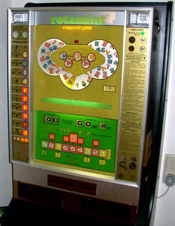 Was muss es für die Automatenfreunde und Insider der Spielerschaft für ein Anblick gewesen sein, das erste mal vor der neuen Exquisit Gold zu stehen... Die Frontscheibe in einer Farbe, die man eigentlich gar nicht genau definieren kann, nennen wir es eine Art Mischung aus Zitronengelb, Olivgrün und Ocker, dazu "fein gekräuseltes" Struktur-Muster. Im oberen Bereich der Scheibe, dort, wo einst das Blech mit dem Schriftzug Positioniert war, auf silberfarbenem Grund (welcher scheinbar das einstige Stirnblech nachahmen soll) in mintgrünen Buchstaben der Rotamint-Schriftzug, darunter goldgelb die Gerätebezeichnung Exquisit Gold in kleinen Buchstaben, das ganze strahlend hell durchleuchtet durch die direkt dahinter positionierte obere Leuchtstoffröhre. Die untere Leuchtstoffröhre hingegen (wie üblich gleichzeitig zur Ausleuchtung der Spielscheiben und der Anzeigetafel genutzt) durchleuchtet eine Verzierung, welche mit etwas Phantasie in etwa einer verschönerten, mehr ins Detail gehenden Vergrößerung des Struktur-Musters entspricht (ebenfalls in mintgrün). Auch die Lackierung der Schablone aus Metall zum Ablesen der Spielscheibenstellungen ist dem Struktur-Muster angepasst. Die Anzeigetafel aus Metall im unteren Bereich der Scheibe wich einer solchen aus Kunststoff, welche von hinten lackiert wurde, was ein besonders edles, kristallenes Glänzen bewirkt. Ein weiterer Vorzug der Kunststofftafel war, dass sie nun noch intensiver in das Spiel einbezogen werden konnte, denn es bot sich die Möglichkeit an, verschiedene Spielsituationen und Spielhinweise genau so wie bei der eigentlichen Frontscheibe durch Leuchten oder Blinken von bunten Feldern kenntlich zu machen. Die Anzeigen für Sonderspiele und Münzspeicher sind nun alle einheitlich, bestehend aus insgesamt drei Doppelzählwerken mit optimal abzulesenden Ziffernanzeigen. Abgerundet wird das ganze durch die zwei goldfarbenen Seitenscheiben, auf der linken Seite nach altbekannter Manier die beiden Lichtjackpots, oben der "Gold"-, unten der "Record"-Jackpot, wobei letzterer der wertvollere ist.