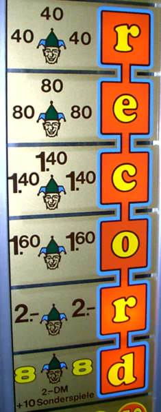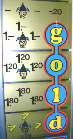 Eine Sache dürfte aber bei allen Spielern generell für Verwirrung und teilweise auch zu "Unstimmigkeiten" geführt haben. In der Regel wird bei allen Spielautomaten bei gleichzeitigem Erscheinen von zwei Gewinnkombinationen (in Verbindung mit dem Joker) die höherwertige gegeben. Das gilt auch für die Exquisit Gold. Dennoch gibt es hier eine Ausnahme: Die goldene Sieben ist auf den äußeren Spielscheiben je einmal in Verbindung mit der 80 Pf, und einmal mit der 1,80 DM vorhanden. Zeigen die Scheiben exakt die Kombination 7/1,80-J-7/1,80, so sollte man davon aus gehen können, dass man einen Gewinn von 1,80 DM erzielt habe. Leider hat man dabei jedoch die Rechnung ohne die Exquisit Gold gemacht. Denn scheinbar war es bei diesem Gerät ein ungeschriebenes Gesetz, dass Symbolgewinne vor Geldgewinnen gelten, und wie bereits beschrieben bringt die Kombination 7-J-7 eben nur 1 DM. Dieser Sachverhalt war offenbar dafür verantwortlich, dass die Anzeigetafeln einiger Geräte späteren Herstellungsdatums mit einem zusätzlichen (nachträglich aufgedruckten!) Hinweis "Alle Gewinnkombinationen sind auf der linken Seitenscheibe dargestellt" versehen wurden. Denn dort wird die Gewinnkombintion für 1,80 DM auch als einzige ohne Joker dargestellt. Aber damit nicht genug. Nicht nur, dass einem gerade noch zu verkraftende 80 Pfennig durch die Lappen gehen - fehlt nur noch der 1,80 DM-Gewinn im Gold-Jackpot, so ist das Erscheinen der angesprochenen Kombination besonders ärgerlich... Die 1,80 ist auf der mittleren Scheibe im übrigen ebenfalls zwei mal vertreten, womit die Treffer-Quote bei der entsprechenden Stellung der äußeren Scheiben im laufenden Spiel für beide Gewinne mit einer Chance von jeweils 1:5 gleichverteilt ist. Um den Gold-Jackpot mit 30 statt 10 Sonderspielen zu laden, ist man infolge dessen, dass die 1,80 DM nur zusammen mit der goldenen Sieben auf den äußeren Scheiben aufzufinden ist, gezwungen auch auf die goldene Sieben zu Spielen, welche zudem auch noch wesentlich häufiger gegeben wird, als die 1,80 (vergl.: 1,80 DM=2:1726, 7-7-7 bzw. 7-J-7=8:1720). Und ist das "d" im "Gold"-Jackpot erreicht, bevor alle anderen Buchstaben leuchten, dann können nur noch die 10 Sonderspiele erzielt werden. Positiv wirkt sich das ganze erst in Sonderspielen aus... nämlich in der neuen 9er-Verlängerungsleiste...