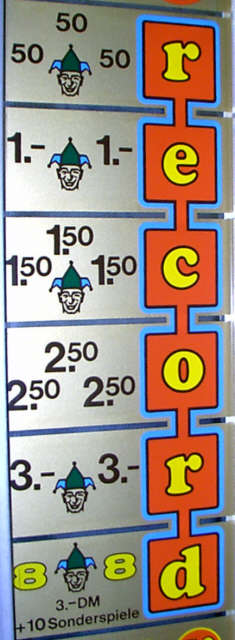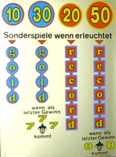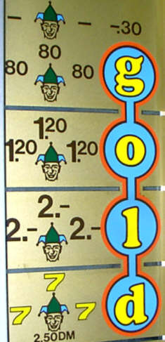 Entsprechend dem neuen Spieleinsatz wurden die Gewinnbeträge durch andere ersetzt, wobei nicht immer automatisch das 1,5-fache der Gewinnbeträge der Exquisit Gold angewendet wurde. Überhaupt wurden die Gewinnbeträge auf den Spielscheiben etwas anders gestreut, als beim Vorgängermodell. Die jeweils zweimal Goldene Sieben und einmal goldene Acht auf den äußeren Spielscheiben, sowie einmal Goldene Sieben und Joker auf der mittleren Spielscheibe blieben allerdings erhalten. Auch im Jackpot wurden Positionen der Gewinnkombinationen verändert. Die Jackpots selbst und dessen Wertigkeiten blieben aber unverändert. Nach wie vor ist oben der blaue "Gold"-Jackpot für 10 oder 30 und unten für 20 bzw. 50 Sonderspiele der rote "Record"-Jackpot angeordnet. Die Chancenverteilung für die Auslösung ist für alle möglichen Situationen in etwa gleich geblieben, zumindest macht sich vom "Spielgefühl" keine spürbare Veränderung bemerkbar. Im Gegenteil: Um die Buchstaben "g", "o" und "l" im "Gold"-Jackpot zu füllen mit dem Ziel 30 statt 10 Spiele zu erzielen, kann man bei der Juwel sogar die "Gefahr" vermindern, vorzeitig das "d" durch 7-7-7 bzw. 7-J-7 zu beleuchten, da sich nunmehr keine Gewinnbeträge mehr in Verbindung mit der Goldenen Sieben auf den äußeren Spielscheiben befinden, welche für den "Gold"-Jackpot benötigt werden. Somit kann man gezielt die Goldene Sieben nachstarten, ohne die anderen benötigten Beträge wegzudrücken. Erfreulicherweise war das Ärgernis mit der verwirrenden Gewinnkombination 7/1,80 - Joker - 7/1,80 von der Exquisit Gold beseitigt worden. Anstelle der 1,80 steht bei der Juwel jetzt eine 2,50. Zwar gilt weiterhin bei der Kombination 7/2,50 - Joker - 7/2,50 "Symbolgewinn gilt vor Geldgewinn", jedoch werden für die Kombination 7-7-7 bzw. 7-Joker-7 ebenfalls 2,50 DM gegeben.