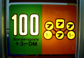 Da das Spielsystem der Goldene 7 Record mit dem der Goldene Sieben identisch und somit auch schon beschrieben ist, gibt es abschließend zu diesem Gerät nur noch etwas neues in Sachen 9er Verlängerungsleiste zu schreiben. Und zwar ist diese Leiste bei der Goldene 7 Record eine aus zwei Zeilen bestehende und dementsprechend auch wieder waagerecht abgeordnete Doppel-Verlängerungsleiste. Oben befinden sich die über eines der Bilder für 3 Sonderspiele erreichbaren großen Verlängerungen bis 100 Spiele (durch drei mal Sieben in Reihe, Häufigkeit 2 in 1728), in der unteren Zeile die kleinen Verlängerungen von bis zu fünf Spielen, einfach zu erreichen durch die Sieben auf der mittleren Spielscheibe. Chancen für große Verlängerungen werden die kompletten letzten 9 Sonderspiele durch angeboten, Kleinere locken in immerhin sieben der neun Spiele.