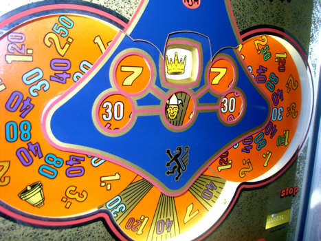 Die Beträge und Symbole auf den Spielscheiben sind wieder kunterbunt, alle Gewinnbeträge haben eine eigene Farbkombination, ungerade Gewinnbeträge haben sogar jeweils zwei unterschiedliche Farben für DM- und Pfennig-Betrag. Lediglich die 2 DM und die 3 DM haben beide die Farbe orange. Allerdings, die gerade erst eingeführten Spielscheiben aus Fiberglas wurden im Laufe der Produktion durch wahrscheinlich preiswertere aus Kunststoff ersetzt. Zwar leuchten die Beträge und Symbole nicht minder hell und bunt, jedoch ging die Brillanz durch die Struktur des bisherigen Materials verloren. Ein weiterer Nachteil besteht darin, dass die Beschriftung der fortan nicht mehr direkt auf die Spielscheiben auflackiert, sondern mittels Folien aufgeklebt wurde. Diese Folien neigen leider dazu, Blässchen zu bilden, was besonders bei ungepflegten Geräten ins Auge fällt. Bei einigen Geräten mussten wir auch feststellen, dass die Folien nicht 100% gerade mit den Rastpositionen der Spielscheiben übereinstimmen, wodurch bei näherem Hinsehen der Eindruck entstehen kann, dass eine oder mehrere Scheiben schief stehen bleiben. Aber auch die bisherigen durchleuchteten Spielscheiben der drei Vorgängermodelle haben ihre eigene negative Eigenschaft: Durch starke Wärmeentwicklung im Gerät verziehen sich die Scheiben und werden krumm, was je nach Krümmungsgrad ein regelrechtes "Eiern" der Spielscheiben verursachen kann. Das kann im schlimmsten Fall dazu führen, dass sich die Scheben während des Laufes gelegentlich berühren, was erstens Beschädigungen der Lackierung und unangenehme Laufgeschräusche nach sich zieht...