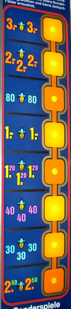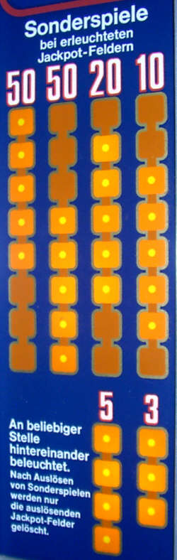 Die hervorgehobenen Gewinnkombinationen 30 Pfennig, 40 Pfennig und 3 DM sind auch in dem anderen ("klassischen") Jackpot auf der rechten Seitenscheibe vorhanden und lassen für den Fall, dass beide Felder aus sind, beide Felder gleichzeitig aufleuchten. Dies führt im übrigen (zumindest bei der 3 DM) auch gelegentlich dazu, dass eine "krumme" Anzahl von 53 Sonderspielen durch Auslösung von Sonderspielen in beiden Jackpots gegeben wird.