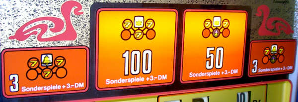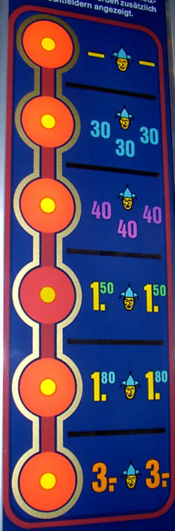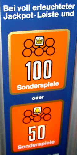 Die übrigen drei Felder sind dafür um so schwieriger erreichbar. Sie sind mit den Gewinnbeträgen 1,50 DM, 1,80 DM und 3,00 DM versehen. Alle drei dieser Kombinationen sind nur in jeweils einer einzigen der 1728 Stellungen der Spielscheiben zu erzielen. Dafür kann sich das Spielsystem aber dann auch den "Luxus" erlauben, bei Auslösung des "klassischen" Jackpots 50 Sondespiele zu gewähren. Erscheint im Spiel der Auslösung beim ersten Lauf der linken Spielscheibe die Glocke (dadurch schaltet die Wechselanzeige oberhalb der mittleren Spielscheibe von Glocke um auf Krone), so wird sogar der Spitzengewinn von 100 Sonderspielen gegeben. Bei nur einem fehlenden Feld beträgt die Wahrscheinlichkeit für die 100er-Serie über diesen Jackpot allerdings nur 1:20735, für die 50er-Serie beträgt sie (ohne Nachstart) 1:1728.