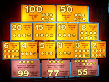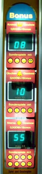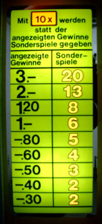 Der Aufbau des Gewinnplans für die Sonderspiele erinnert in seiner Form eher an solche der Merkur-Geräte der 70er Jahre.