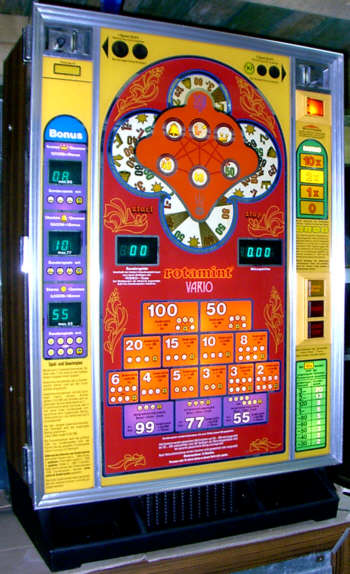 1981 war es dann soweit. Nachdem im Vorjahr die ersten beiden elektronisch gesteuerten Triomint-Geräte in die Aufstellung kamen, erschien auch die erste durch Mikroprozessortechnik gesteuerte Rotamint. Sie ist gleichzeitig auch die erste Rotamint mit Risikospiel. Sie ist mit dem selben Risikospiel ausgestattet wie die Triomint Gold. Die vier Ausspielfelder sind aber nicht über den Spielscheiben, sondern auf der rechten Seitenscheibe positioniert. Dort hin wurden auch die Spieltasten verlegt. Wenn auch auf viele liebgewonnene, typische Details einer Rotamint verzichtet wurde, so ist sie ein angenehm buntes Gerät. Trotzdem ist leider auch genau so wie bei den beiden ersten Triomint Geräten zu bemängeln, dass das Gerät ziemlich dunkel ausgeleuchtet ist, was aus dem völligen Verzicht auf den Einsatz von Leuchtstoffröhren resultiert. Auch das einst so beliebte, schon bei der Doppel-Jackpot ohnehin spärlich bestückte Spielelement, die Serienverlängerungsleiste wurde seit Erscheinen der Vario nie wieder angewendet. Gewinne werden auch nicht mehr durch einen Gong signalisiert, anstelle dessen werden über einen Lautsprecher diverses Töne zur Untermalung der jeweiligen Spielsituation erzeugt.![]()