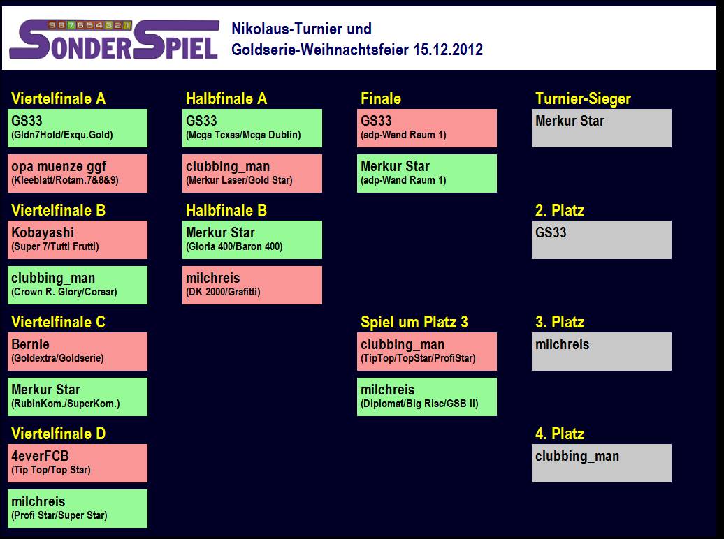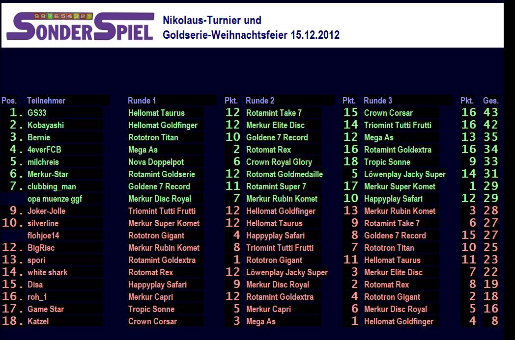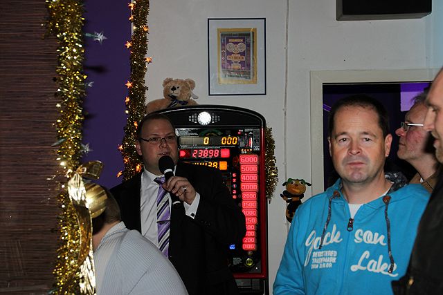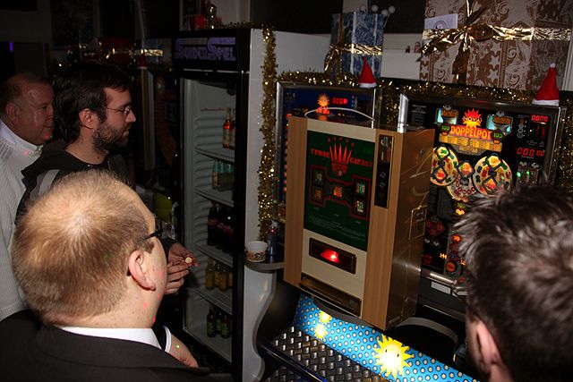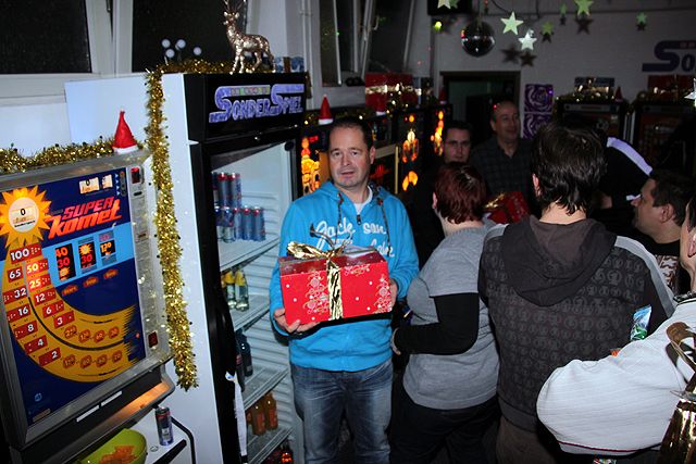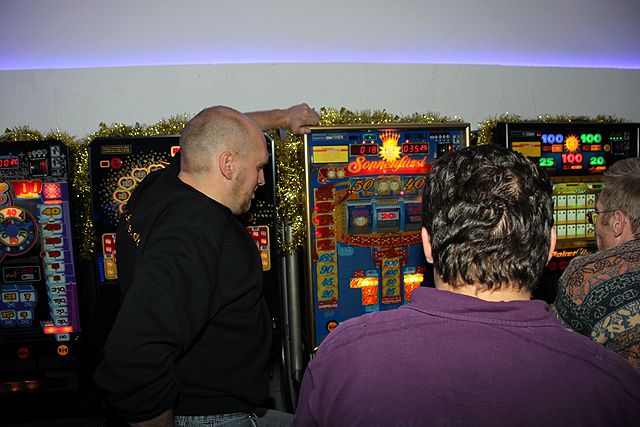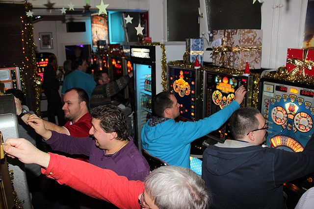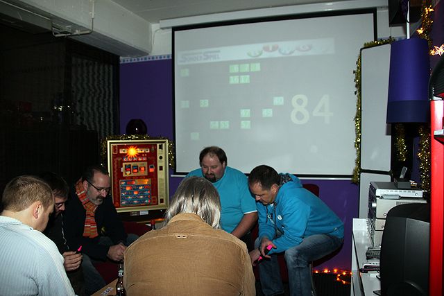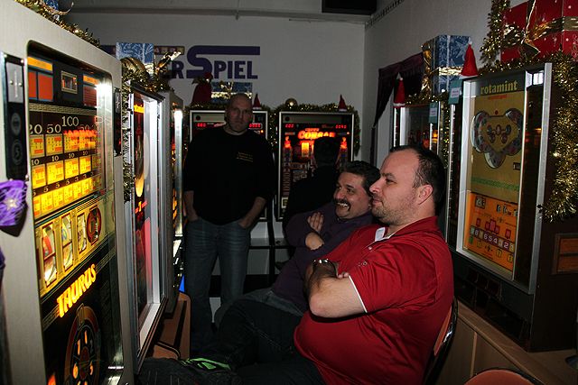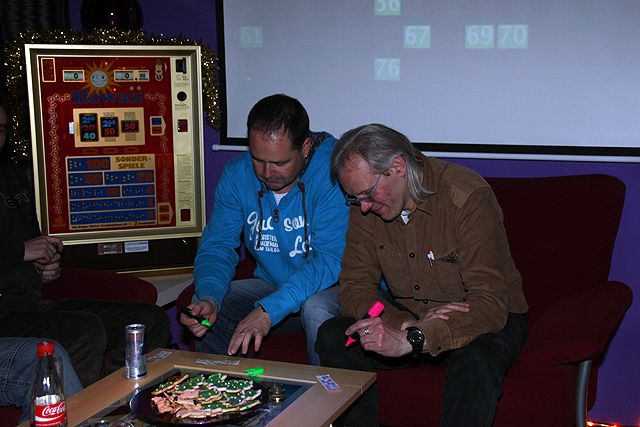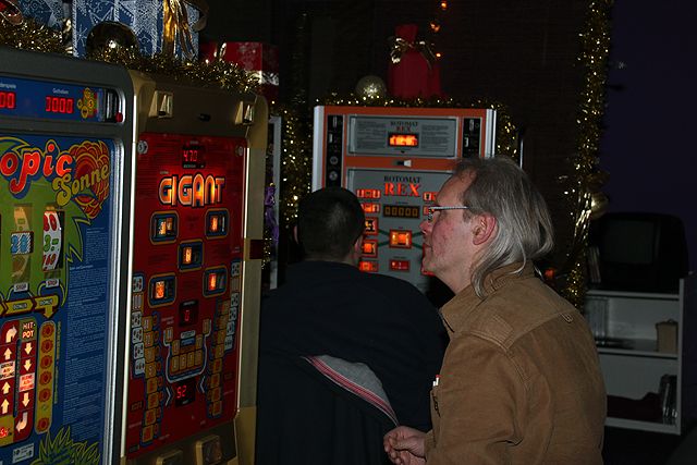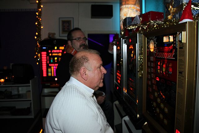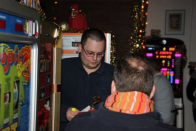 Vor und nach dem Essen wechselten auf dem Parkplatz wieder etliche Geräte ihren Besitzer, denn nach wie vor wird die Weihnachtsfeier gerne dazu genutzt, sich Geräte mitbringen zu lassen und sie dann auf der Weihnachtsfeier auszutauschen. Am Ende waren jedenfalls alle satt und zufrieden, und so konnte es nach dem reichhaltigen Abendessen mit einer weiteren Runde Bingo weitergehen, bevor die Finalrunden eingeläutet wurden. Auch im diesjährigen Weihnachtsturnier bestand die Regel, wer 50 oder mehr Sonderspiele auf dem Zähler hat, hat die Runde für sich entschieden. Bei den 20Pf.-Geräten hätten bereits 40 Sonderspiele gereicht. Während der ganzen Finalrunden hat aber kein einziger Spieler eine so hohe Anzahl an Sonderspielen erreicht, so dass alle Runden durch die Zeit entschieden wurden.