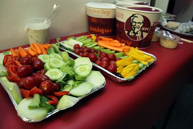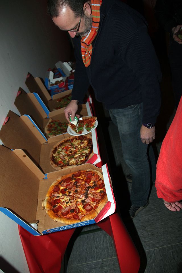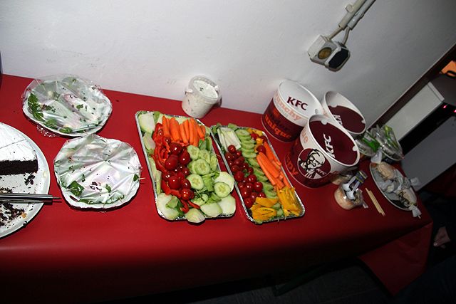 Nach den Qualifikationsrunden gab es mit einer leichten Verzögerung ein herrliches Buffet bestehend aus Pizza, Hähnchenteilen und Salat von KFC und der bereits erwähnten Rohkostplatte, die so_isses von seinen Kindern extra hatte anfertigen lassen. Ob die Verzögerung damit zusammenhing, dass Bernie um 17:38 Uhr Chris gebeten hat, sie möge ihn doch bitte um halb sechs daran erinnern, dass er beim KFC anrufen muss, ist nicht bekannt.