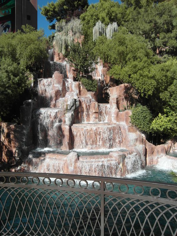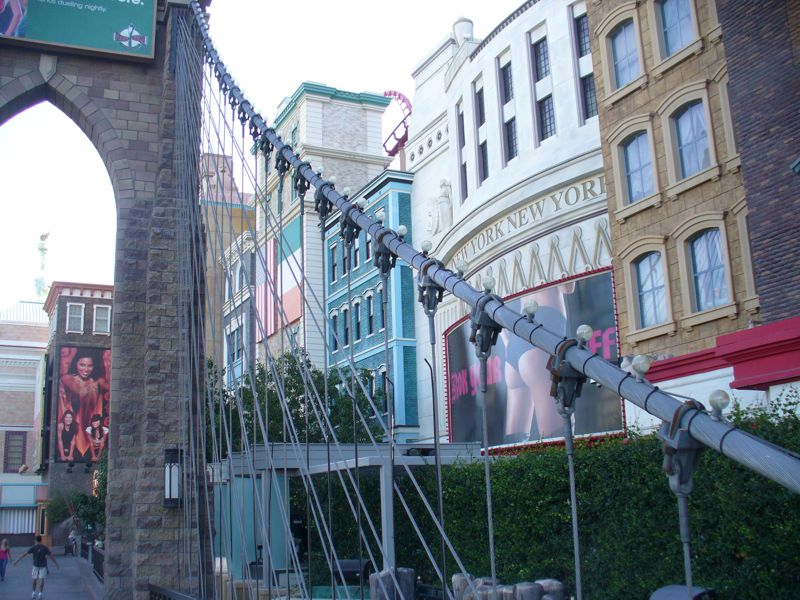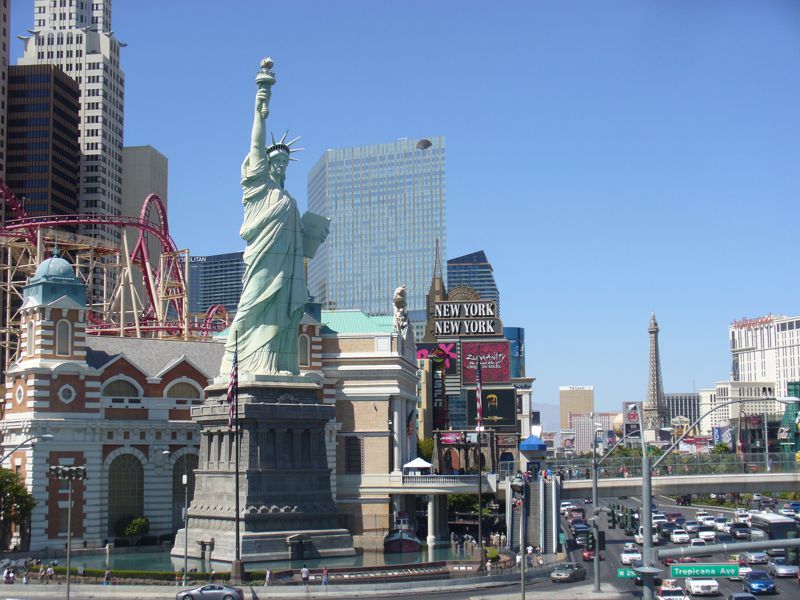 Gleich nebenan grüßt die Kopie der Freiheitsstatue am Hotel New York New York, das außen und innen entsprechend gestaltet ist. Rechts im Bild sieht man eine der Fussgängerbrücken über den Strip. Das Wechseln der Strassenseite ist aufwändig. Entweder gibt es Fussgängerampeln, an denen man gefühlte 5 Minuten wartet und dann mit einer Digitalanzeige in 20 Sekunden über 10 Fahrspuren gehetzt wird, oder die besagten Brücken. Diese enden aber nicht einfach auf der anderen Strassenseite, sondern meist im Gebäude. Dort landet man dann im Casino, und sucht mühsam den Weg raus ins Freie. Geschäft ist Geschäft !