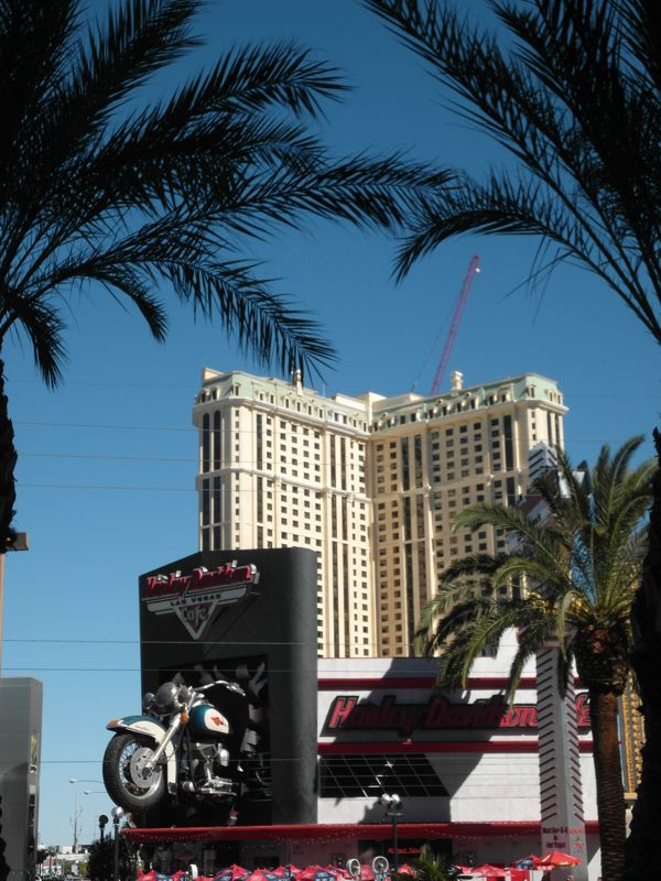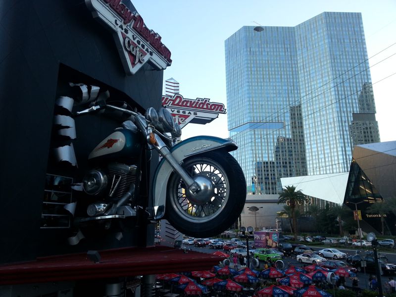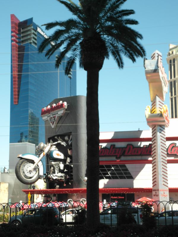 Von der anderen Strassenseite im Hintergrund eines der Aria Gebäude, und im Vordergrund das Harley Davidson Cafe.