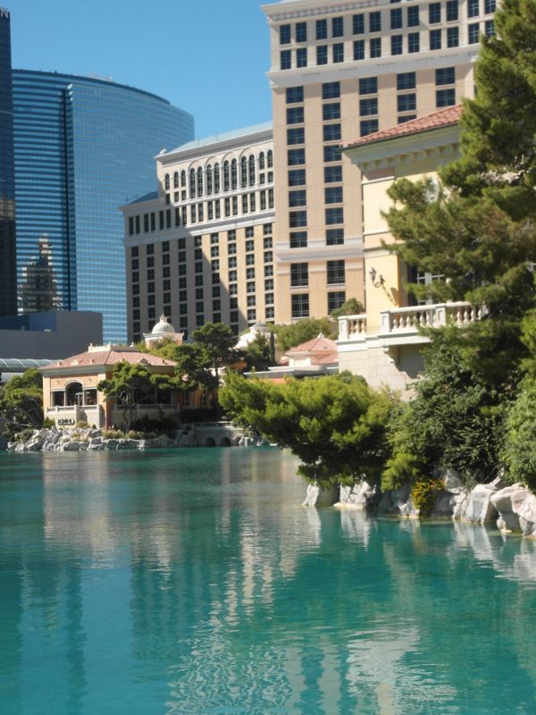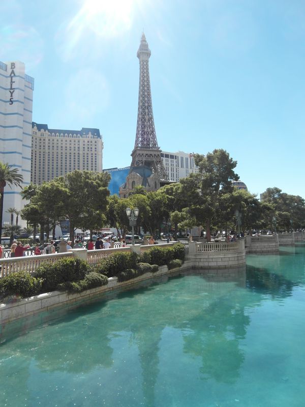 Wieder auf der anderen Strassenseite sieht man über den See des Bellagios hinweg das Ballys, das Paris Paris und das Planet Hollywood.