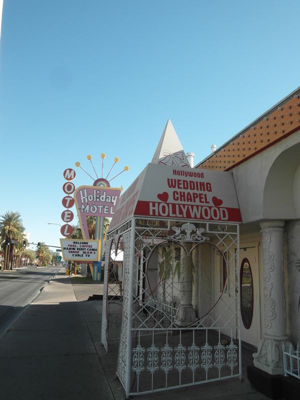 Nach mehreren Kilometern Brachfläche nähert man sich Downtown, dem ursprünglichen Zentrum von Las Vegas, in dem das Herz der Stadt wieder zu schlagen beginnt. Dazwischen mag man sich nachts nicht mehr ganz so unbeschwert wie am Strip bewegen. Mehrere Wedding Chapels bieten ihre etwas merkwürdigen Leistungen an. Wer mag schon im schrägen Gesang eines Elvis-Doubles heiraten?