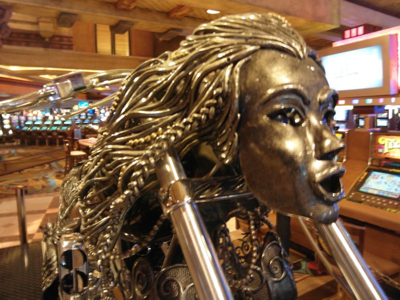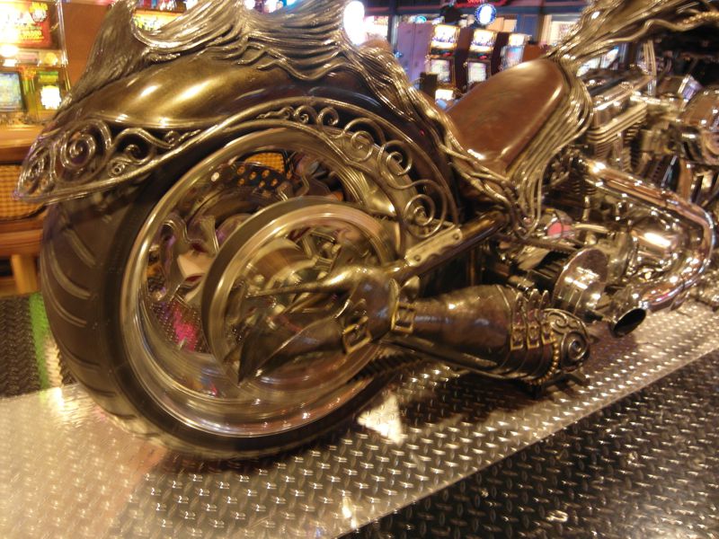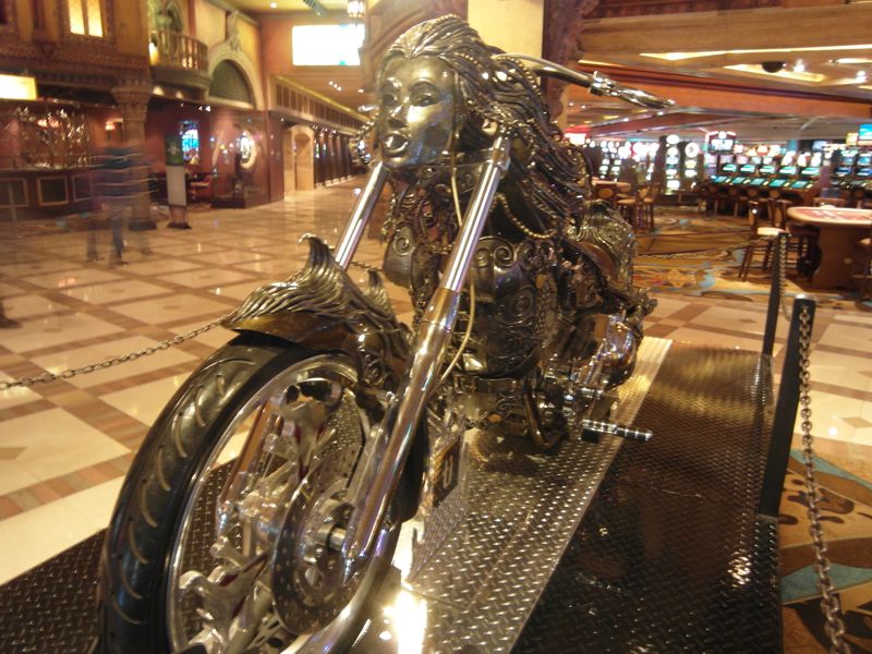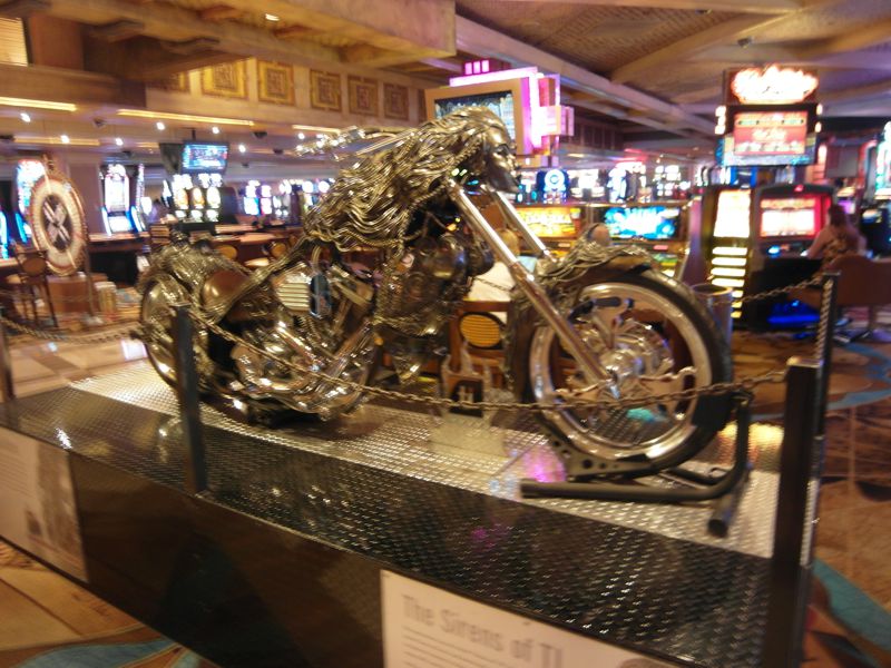 Ein von Fans des Treasure Island gebautes Motorrad im Siren-Stil (siehe Video später). Leider unscharf, meine Kamera hat in dem diffusen Licht versagt. Aber sehr eindrucksvoll, soll sogar fahrbereit sein.