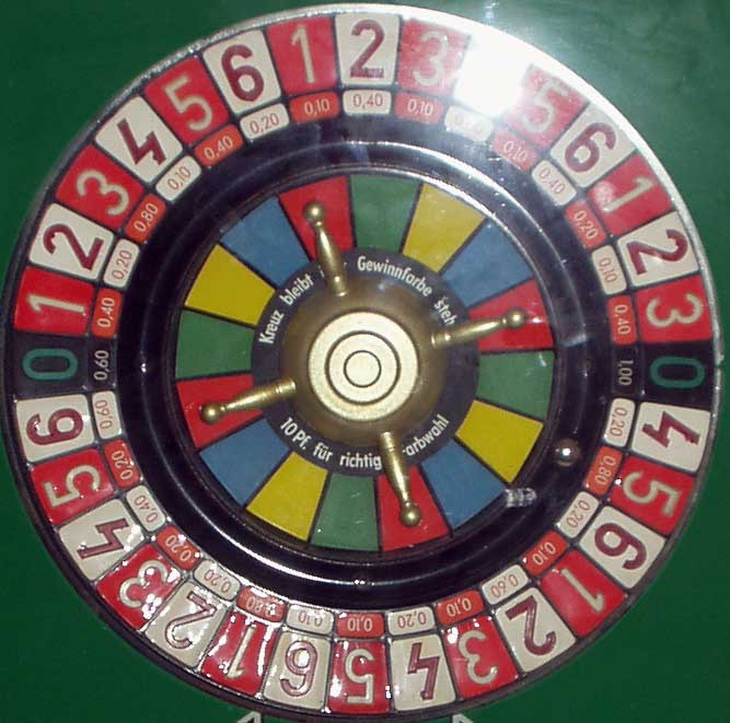 Beim Aufleuchten des Feldes „Zahl wählen“ oder „Farbe wählen“ kann ein persönlicher Gewinntipp auf 0 bis 6 abgegeben werden und zusätzlich eine Farbe ausgewählt werden, bis zum Aufleuchten des Feldes „nichts geht mehr“. Das Foto zeigt die Gewinnverteilung, gewonnen hat hier 5 (0,80 Pfg.) und rot (Auszahlung 0,20 Pfg.).