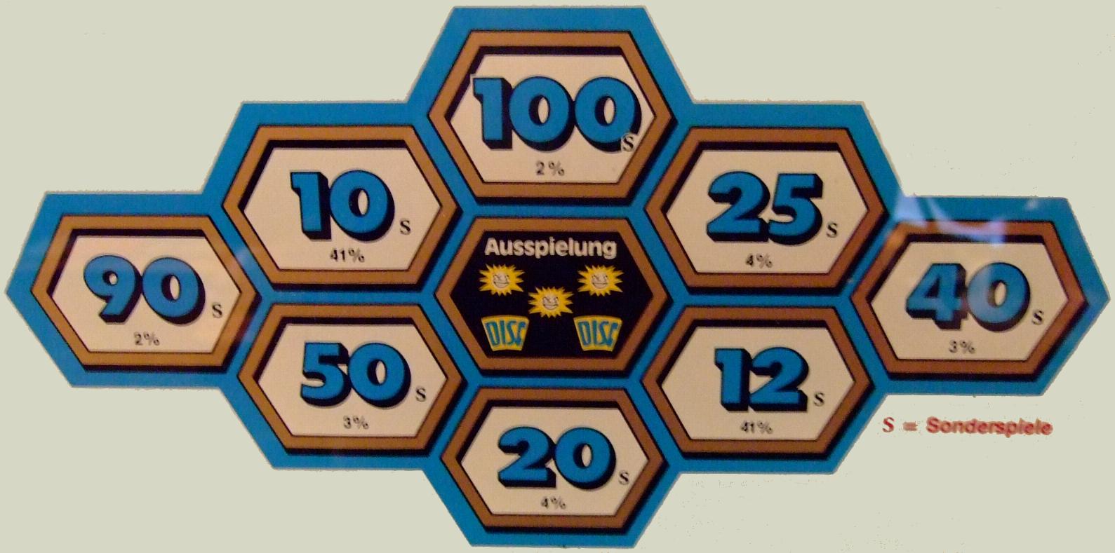 Scheibe außer bei Münzspeicher Das eingeworfene Geld und die Gewinne werden gespeichert. Bei Betätigen der Auszahltaste wird der gespeicherte Betrag ausgezahlt; durch Betätigen der Start-Taste wird die Auszahlung beendet und ein neues Spiel gestartet. Erreicht der Münzspeicher 100,- DM wird ein Teilbetrag ausgezahlt. Das Gerät zahlt im Durchschnitt mindestens die gesetzlich vorgeschriebenen 60 % der Einsätze aus. |