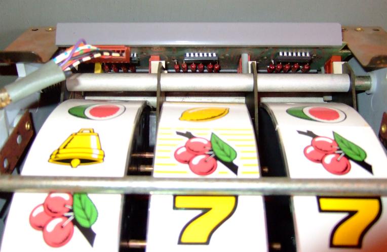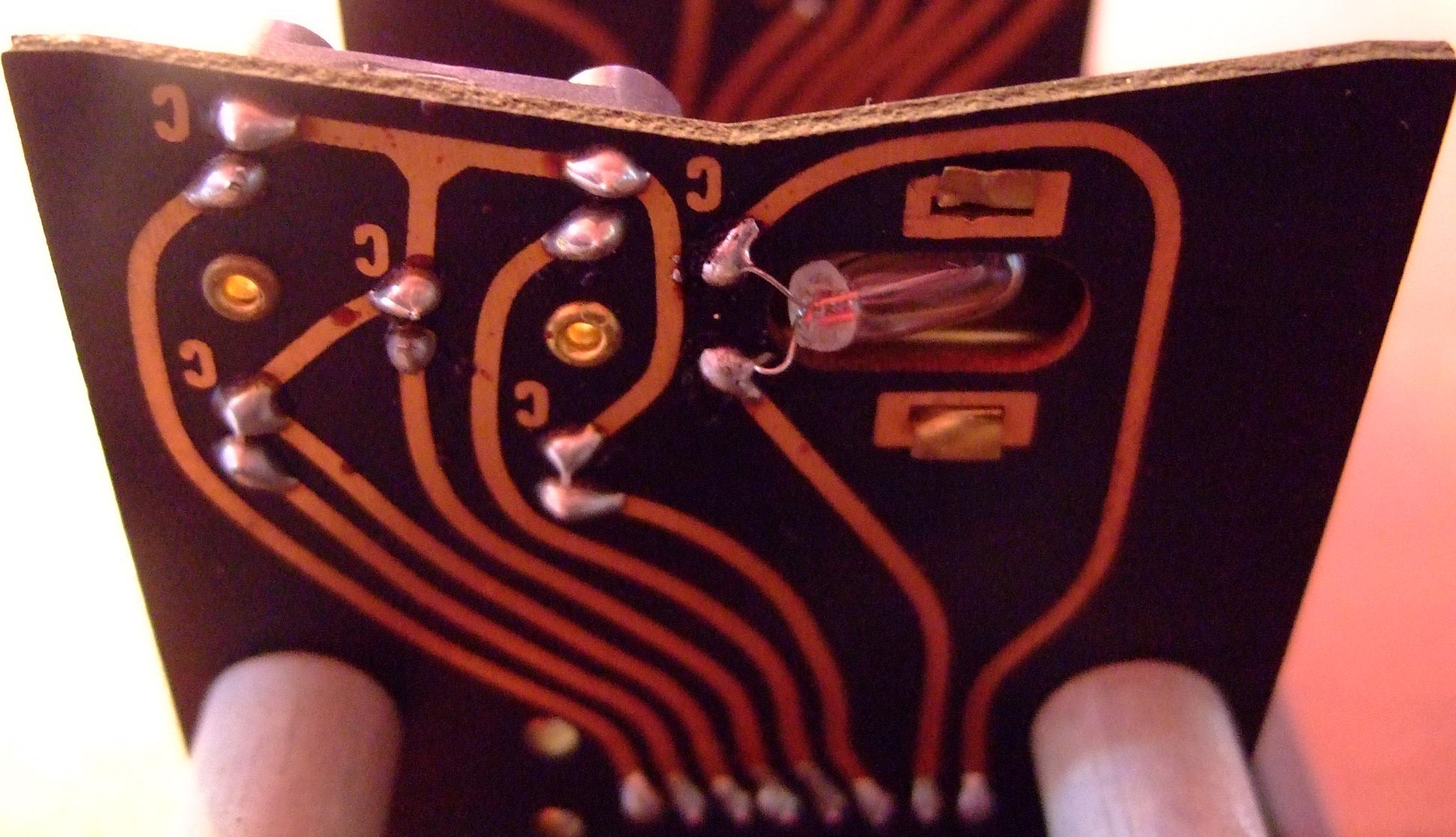 Die Gewinnregistrierung erfolgt durch Fotoabtastung der Walzenstellung. Ist ein Lämpchen ausgefallen läuft der Automat kurz an und stoppt sofort wieder. Eingeworfenes Geld wird sofort ausgezahlt. Die Platine mit den Lämpchen ist über den Walzen. Durch Hochklappen der Federn an beiden Seiten und vorheriges Abziehen des Steckers kann die ganze Walzeneinheit heruntergeklappt werden. Die Platine ist mit 4 Schrauben befestigt. Es sind 3 Miniaturlämpchen, die an der Rückseite jeweils eine Abdeckung haben. Typ T1 4,5x12mm 6,3V / 200mA |