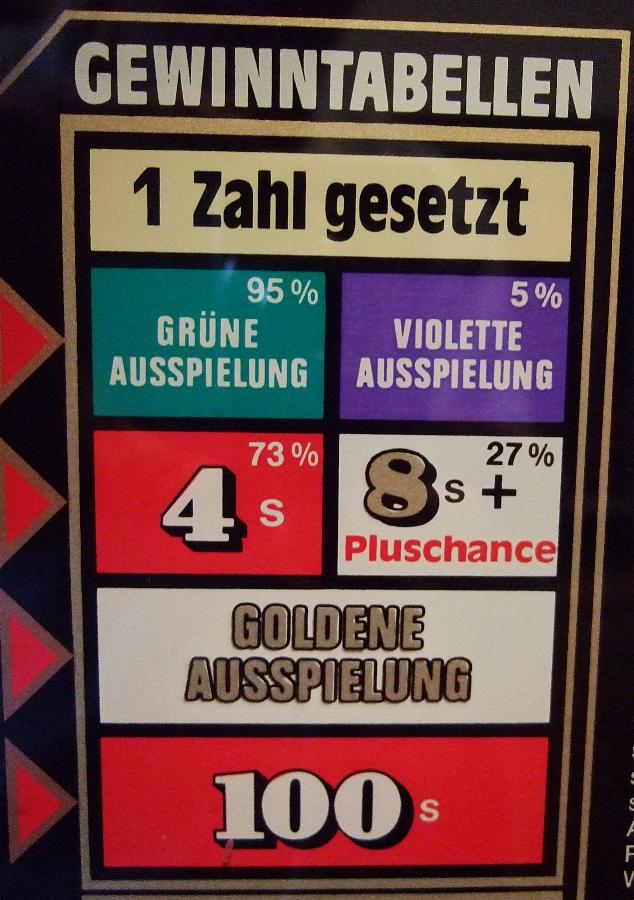 Wird in der Gewinntabelle „Pluschance“ erreicht, so leuchtet das Feld „8 S + Pluschance“ auf. Feld „2 S“ wird eingeschaltet, und es erfolgt eine erneute Ausspielung im Kessel. Wird dabei „0“ erreicht, so werden 8 S + 2 S gegeben. Anderenfalls wird auf die nächste Stufe der Pluschancenanzeige weitergeschaltet. Wird bis zur höchsten Stufe keine „0“ ausgespielt, so werden 8 S + 2 S gewonnen.