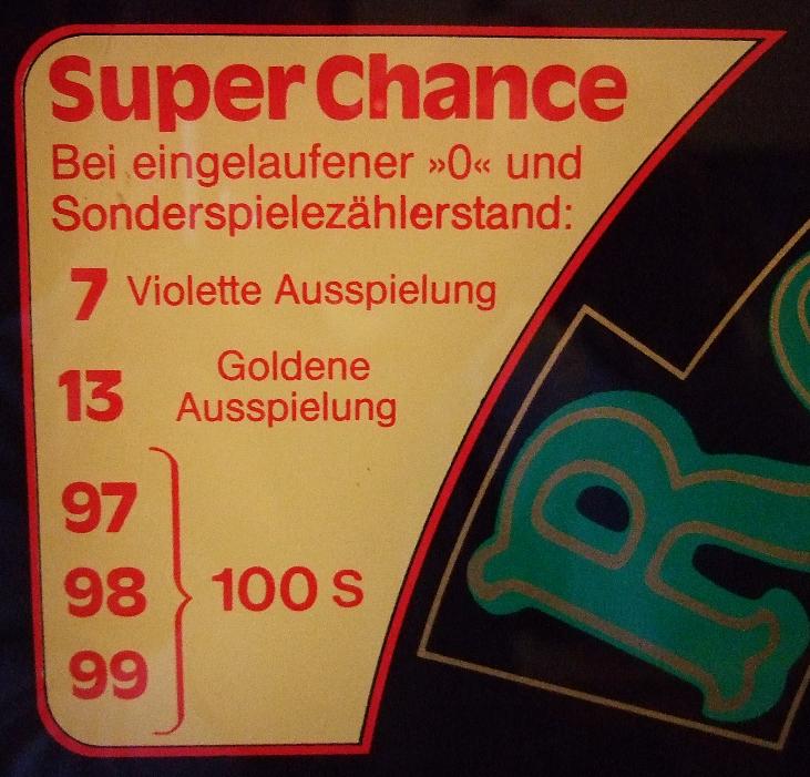 Innerhalb von Sonderspielen werden bei Übereinstimmung der gesetzten mit der ausgespielten Farbe 3 DM gewonnen. Wird „0“ ausgespielt, werden 2 Sonderspiele gegeben. In Sonderspielen werden weitere Sonderspiele bis max. 200 addiert. (In Sonderspielen kein Bingo). Bei „0“ und Sonderspielestand 7 wird eine VIOLETTE, bei Sonderspielestand 13 eine GOLDENE Ausspielung gegeben; bei Sonderspielestand 97,98 und 99 werden 100 Sonderspiele gegeben (Superchance)