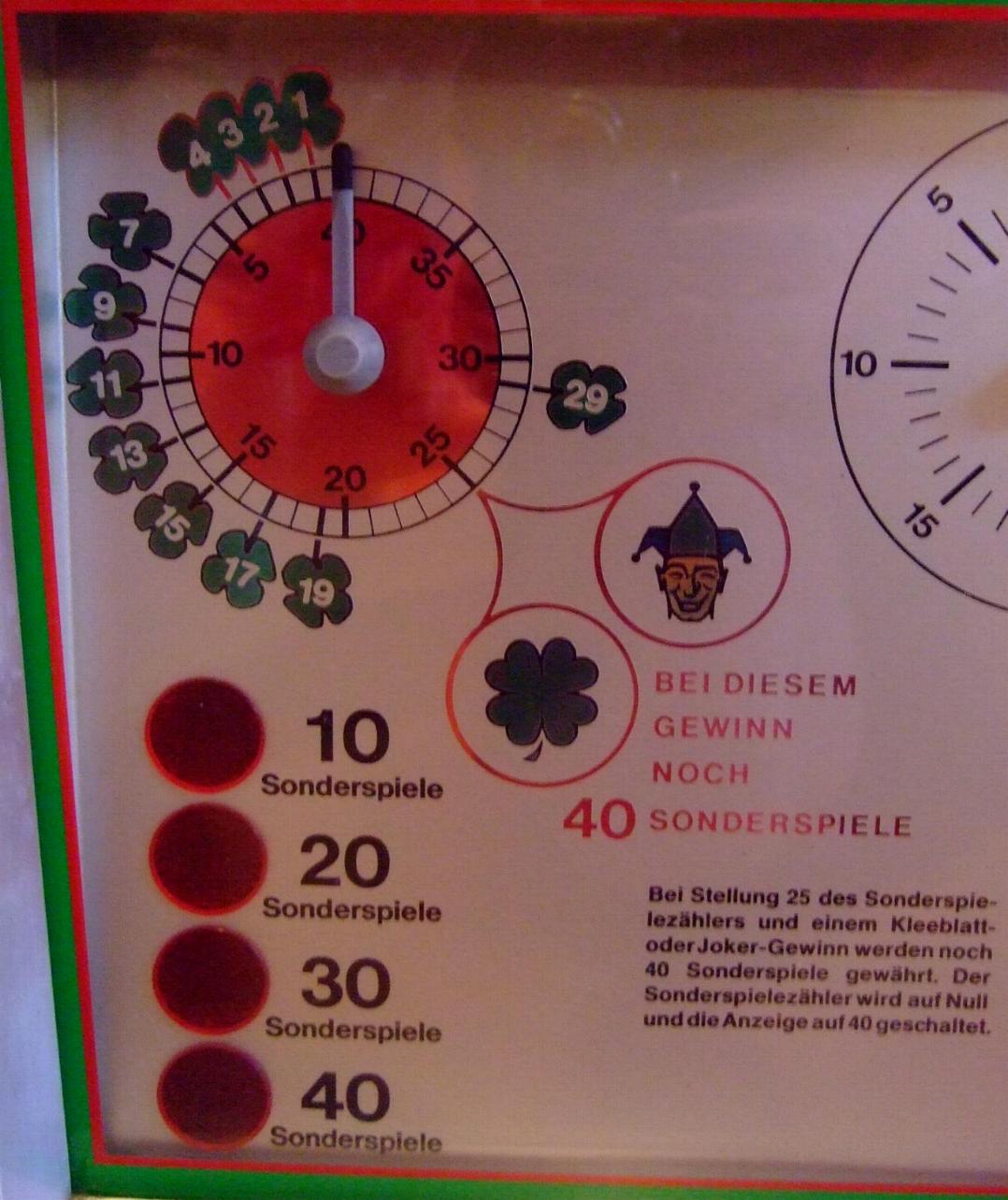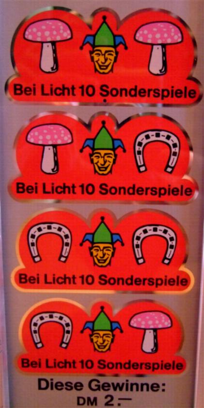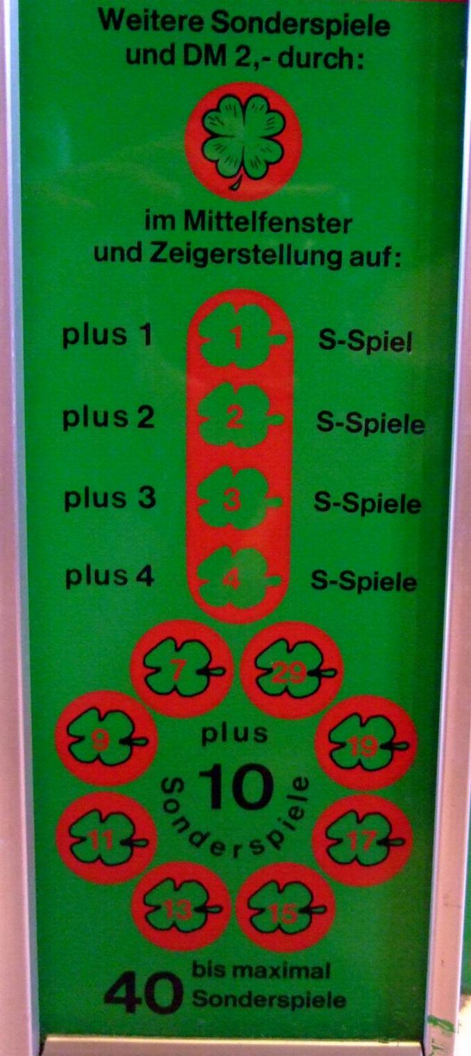 In Ablesestellung ergeben dreifach übereinstimmende Beträge oder zweifache zusammen mit dem Joker den jeweils höchsten angezeigten Gewinn. Kleeblatt oder Joker allein gewinnen DM -,20. Bei den Kombinationen Pilz-Joker-Pilz sowie Pilz-Joker-Hufeisen, Hufeisen-Joker-Hufeisen und Hufeisen-Joker-Pilz werden DM 2,- gewonnen. Das Symbol 1,20 auf der linken Scheibe lässt auf der linken Seite des Gerätes die vier Felder mit den Pilz-Joker-Hufeisen-Symbolen aufleuchten. Im darauffolgenden Spiel werden durch eine der dort gezeigten DM 2,- Kombinationen 10 Sonderspiele gewährt. Bei 7-Joker-7 oder 8-Joker-8 werden DM 2,- gewonnen und 10 Sonderspiele gewährt. Während des Ablaufs der Sonderspiele wird jeder Gewinn auf DM 2,- erhöht. Außerdem gewinnen die goldenen Felder der Mittelscheibe allein ebenfalls DM 2,-. Steht der Zeiger des Sonderspielzählers auf einem grün gekennzeichnetem Feld. so löst das Kleeblatt auf der mittleren Scheibe weitere Sonderspiele aus (siehe Plan linke Seite). Die Sonderspiele werden bis max. 40 auf dem Sonderspielzähler addiert. Die Zahl der noch verfügbaren Sonderspiele ergibt sich als Differenz der Lichtanzeige zu der Zeigerstellung des Sonderspielzählers. |