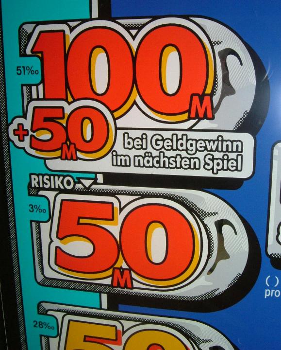 Bei 100M können noch einmal 50M zusätzlich gewonnen werden, falls im nächsten Spiel ein Geldgewinn erfolgt !