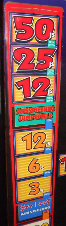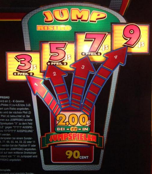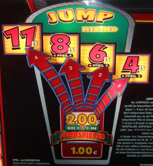 Bei Jumprisiko ( 7 bzw. 20 Cent Symbol) wird ein 2,- €-Gewinn gemäß des beleuchteten Pfeiles (1) zu 4JS bzw. 3JS gegen 1,- € bzw. 90 Cent zum Risiko angeboten. Nach erfolgreichem Risiko wird der nächste Pfeil (2) beleuchtet usw. bis der Pfeil (4) beleuchtet ist. Bei beleuchtetem Pfeil (4) können aus Jumprisiko erzielte 11JS bzw. 9JS außer im Spielsystem "X" zu dem Feld "AUSSPIELUNG JUMPSPIELE" gegen "777 AUSSPIELUNG" bzw. "77/7/7 bzw. 7/7/77 AUSSPIELUNG" riskiert werden. Dieser Schritt scheint nicht empfehlenswert, da selbst wenn die Jumpausspielung erreicht wird die Ausspielwahrscheinlichkeit von 12JS/10JS noch 600%o beträgt. Und 11JS/9JS sind ja schon sicher. In Sonder- bzw. Supersonderspielen bei einem Sonderspielestand von 99, 88, 77, 66, 55, 44, 33, 22 oder 11 oder generell in Jumpspielen werden bei der Position 7 oder 20 Cent Symbol auf dem mittleren Drehkörper ein Jumprisiko angeboten. Bei den Positionen 20 und 25 auf dem mittleren Drehkörper und einem Sonderspielezählerstand von 1 im Jumpspiel wird ebenfalls ein Jumprisiko angeboten. |