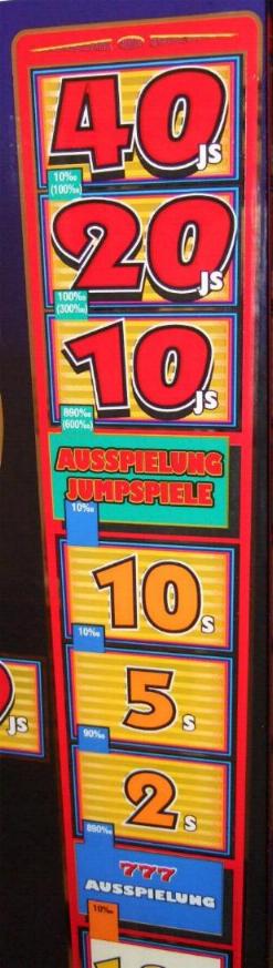 In Supersonderspielen und Jumpspielen wird der mittlere Drehkörper bei Nichtgewinn und dem Symbol - 40 - automatisch eine Position weitergedreht. (Das nächste Feld ist ein goldenes Feld). Diese Spiele werden ohne Abbuchung des Spieleinsatzes abgespielt. Sonderspiele werden bei den dargestellten 7er-Kombinationen ausgespielt und zusätzlich 20 Cent gegeben. In einer Serie werden bei jeder Gewinnkombination oder goldenem Feld 2,- € gegeben. Mit Erreichen von Supersonder- bzw. Jumpspielen werden bereits angezeigte und neu hinzugewonnene Sonderspiele als Supersonder- bzw. Jumpspiele gewertet. In Jumpspielen gelten bei "AUSSPIELUNG JUMPSPIELE" die in Klammern angegebenen Ausspielwahrscheinlichkeiten. |