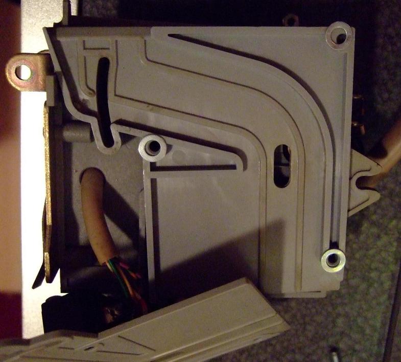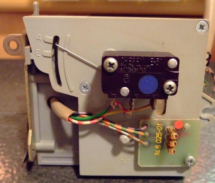 Das 50 Cent Stück muss noch durch die Münzdurchlaufeinheit und den Drahtbügel passieren, der das Aufbuchen durch den Microschalter veranlasst, bevor es in die Röhre fällt. Der Münzdurchlauf für 1 DM / 50 Cent ist entsprechend zu verbreitern. Dazu die entsprechenden Schrauben lösen und innen den Durchlauf mit 3 Unterlegscheiben verbreitern. |