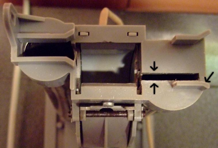 Der Schlitz auf der Oberseite der Röhre für 1 DM / 50 Cent ist etwas zu verbreitern. Mit einer Feile auf beiden Seiten soviel wegnehmen bis die 50 Cent Stücke problemlos durchgehen. Auch am Seitenteil (äußerer Pfeil) an der Innenseite etwas wegfeilen, damit die Münzdurchlaufeinheit nach der Verbreitung durch die Unterlegscheiben auch wieder draufpasst. |